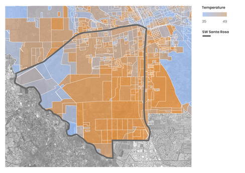 These maps show the average temperature, amount of vegetation (NDVI), impervious surface, and canopy cover in Southwest Santa Rosa. The maps provide data-driven evidence to corroborate the lived experience and knowledge of Southwest Santa Rosa residents.